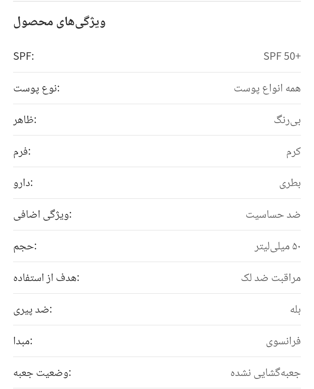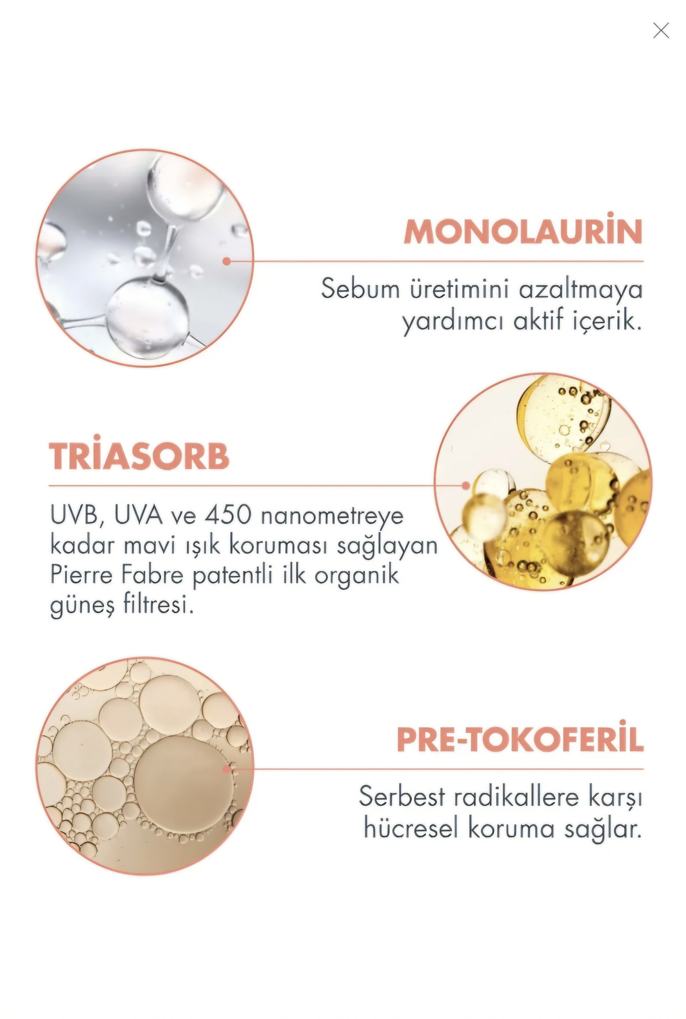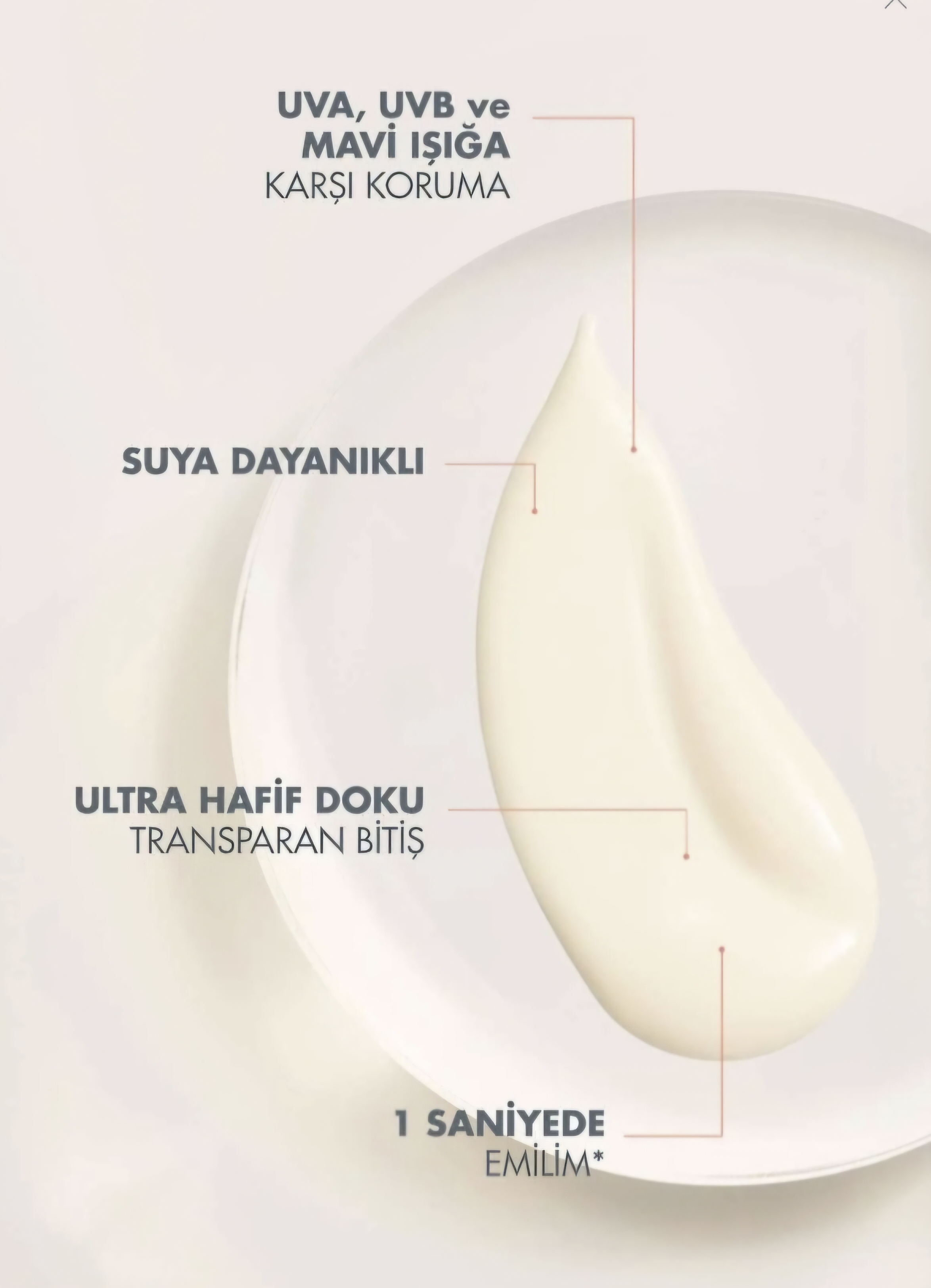ضدپیری پوست ، محصول فرانسه . محافظت در برابر اشعههای UVA، UVB و نور آبی . کرم ضد آفتاب اولترا فلوئید نامرئی SPF50 با محافظت بسیار بالا برای پوستهای معمولی و مختلط، به لطف فیلتر TriasorB موجود در فرمول خود، از پوست در برابر اشعههای UVA و UVB خورشید محافظت میکند.همچنین محافظت بالایی در برابر نور آبی ساطع شده از صفحات نمایش دیجیتال مانند تلفن و تلویزیون ارائه میدهد.• بافت فوق العاده روان به خاطر ساختار سبک خود مانند آب، به عنوان یک ضد آفتاب برای پوستهای معمولی و مختلط، بدون ایجاد حس سنگینی روی پوست، به سرعت جذب میشود و حس چربی به جا نمیگذارد.این محصول برای استفاده روزانه به عنوان پایه آرایش مناسب است و استفاده راحت در طول روز را فراهم میکند.فرمول با تحمل بالا، بدون عطر و مقاوم در برابر آب آن برای پوستهای حساس طراحی شده است.• جذب در ۱ ثانیه*به لطف بافت سبکی که مانند آب دارد، در عرض ۱ ثانیه جذب پوست می شود