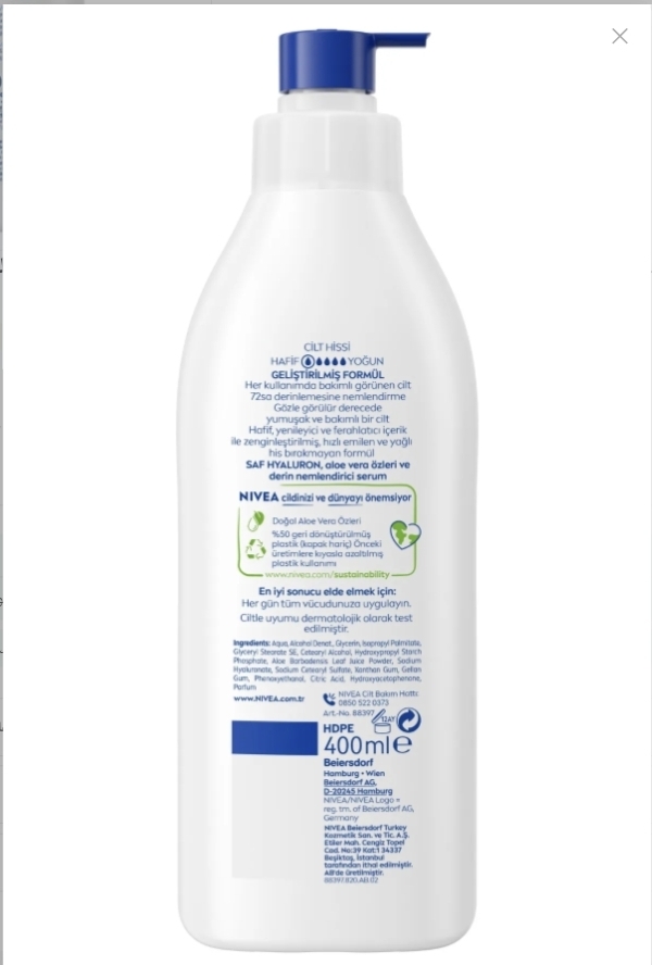لوسیون بدن نیوآ آلوئه ورا از محبوبترین برند مراقبت از دست و بدن ترکیه، نیوآ، حاوی هیالورون خالص، سرم مرطوبکننده عمیق و آلوئه ورا است.مرطوب کننده عمیق بدن ۷۲ ساعته: فرمول این محصول رطوبت را در اعماق پوست حبس میکند و به مدت ۷۲ ساعت نرمی قابل توجهی را برای پوست فراهم میکند.با هر بار استفاده، پوستی شاداب و با ظاهری زیبا را برای شما به ارمغان میآورد.لوسیون بدن نیوآ فوراً جذب میشود و حتی تنها با یک بار استفاده، پوست شما را تسکین میدهد، طراوت میبخشد و رایحهای دلپذیر به آن میبخشد و با هر بار مراقبت، آن را تجدید میکند.مناسب برای انواع پوست معمولی و خشکسازگاری آن با پوست از نظر پوستی تایید شده است.نحوه استفاده: برای استفاده روزانه، لوسیون بدن نیوآ آلوئه ورا ۴۰۰ میلیلیتری را به آرامی روی تمام بدن خود پخش کرده و ماساژ دهید.تضمین مراقبت نیوآ: با ۱۱۰ سال تخصص در مراقبت از پوست، ما موادی را با بالاترین استانداردهای کیفی انتخاب میکنیم
